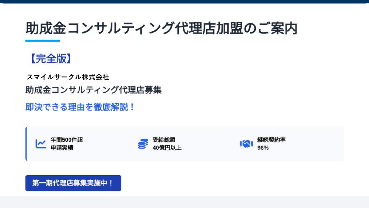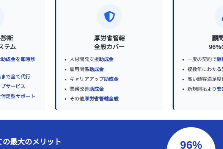| サービスの強み | ・助成金無料診断完全代行システム ・厚生省管轄全般カバー ・顧問契約率96%の継続性 |