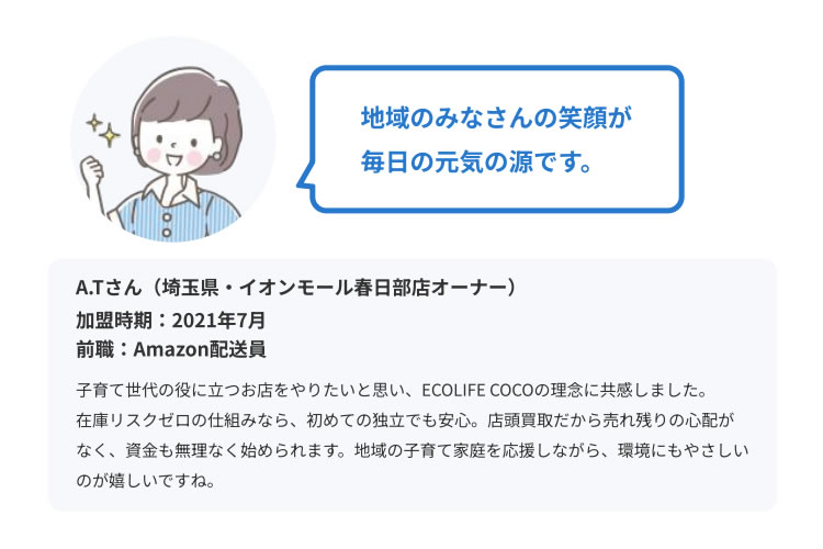 子育て世代の役に立つお店をやりたいと思い、ECOLIFE COCOの理念に共感しました。