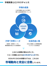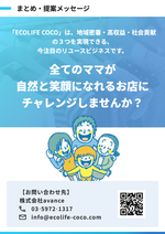 「ECOLIFE COCO」は、子育て世帯向けの商品を中心に取り扱うリユースショップで、子供服やベビー用品、育児グッズなどを循環させることで、家計負担の軽減と環境配慮を同時に実現するビジネスです。