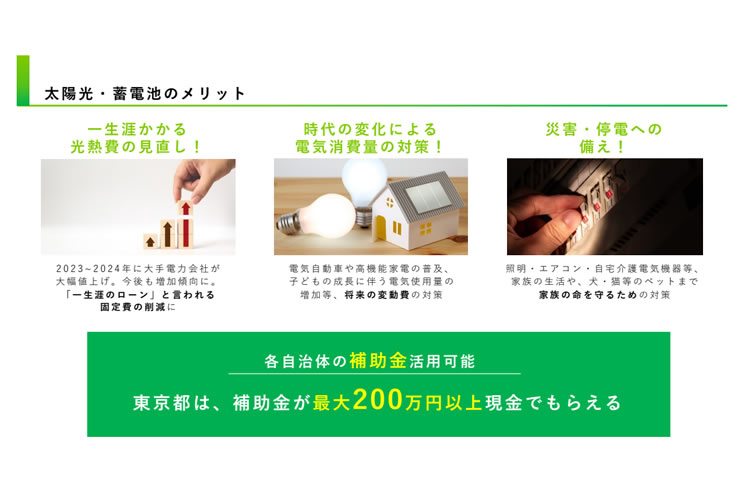 | 弊社の強み | ①創業20年、延べ250社以上の⼤⼿上場企業や電⼒会社との提携実績 ②ハウスメーカーNO1営業マンが構築した営業の仕組みを活⽤できる ③お客様に安⼼していただける⼿厚いアフターフォロー ④助成⾦を活⽤した提案を全国各地で対応できる ⑤各種申請や事務作業など全て弊社がサポートするため、営業に専念できる |