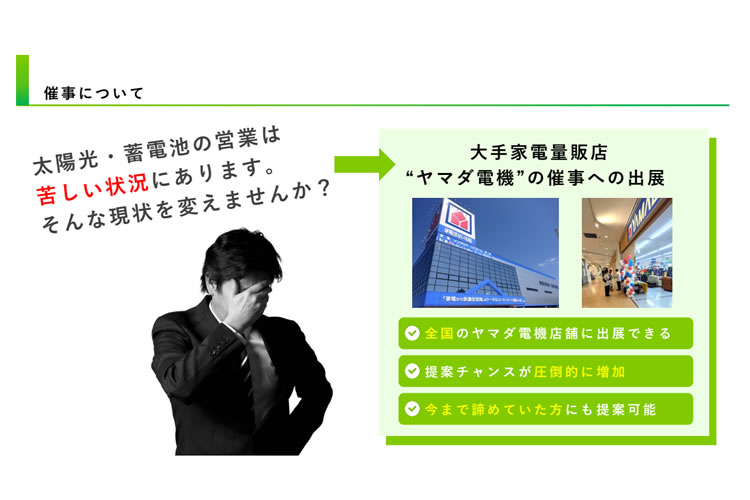 安定した収益が見込めるビジネス!「太陽光・蓄電池 ヤマダ電機催事販売」法人パートナー募集