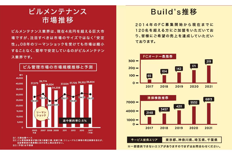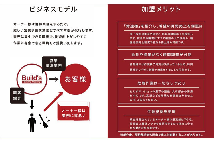 「Build’s」は、顧客獲得のための営業活動や請求書発行業務などを本部がおこなう仕組みがあり、オーナーは売上保障制度により必ず安定した収入があるため、安心して独立ができるビジネスモデルとなっております。また、特徴として1ヶ月間の研修制度や開業後のフォロー体制が充実しているため、清掃経験や特別な資格がなくても始めることが可能であり、現在500名以上在籍しているオーナーの9割以上は未経験でスタートしております。
