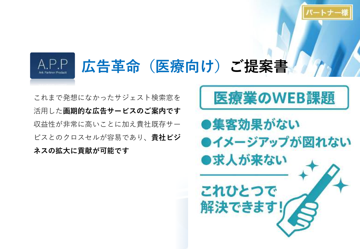 検索サジェストを活用した広告商材「クリニック向け PR&風評対策サービス」OEMパートナー募集