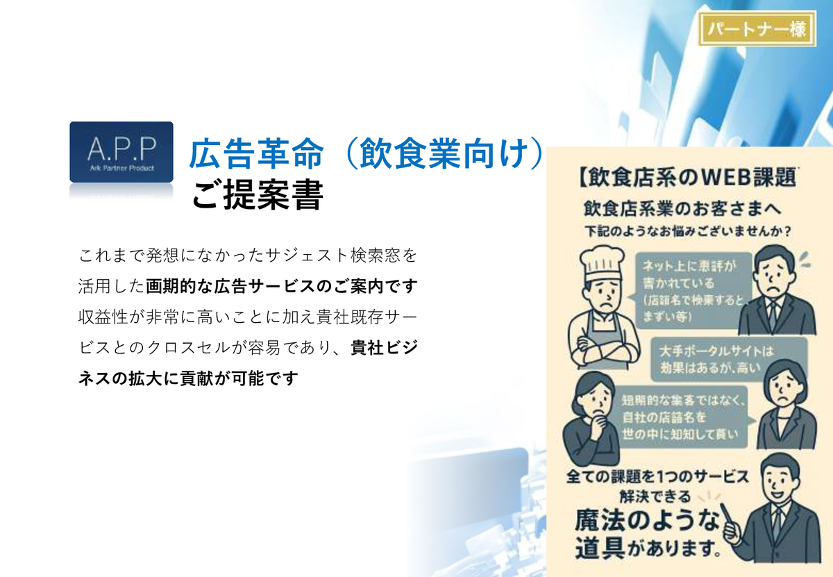 検索サジェストを活用した広告商材「飲食店向け PR&風評対策サービス」OEMパートナー募集
