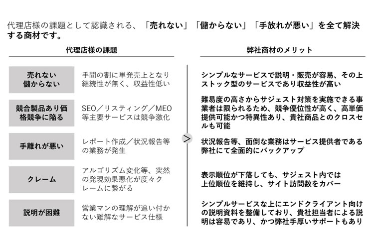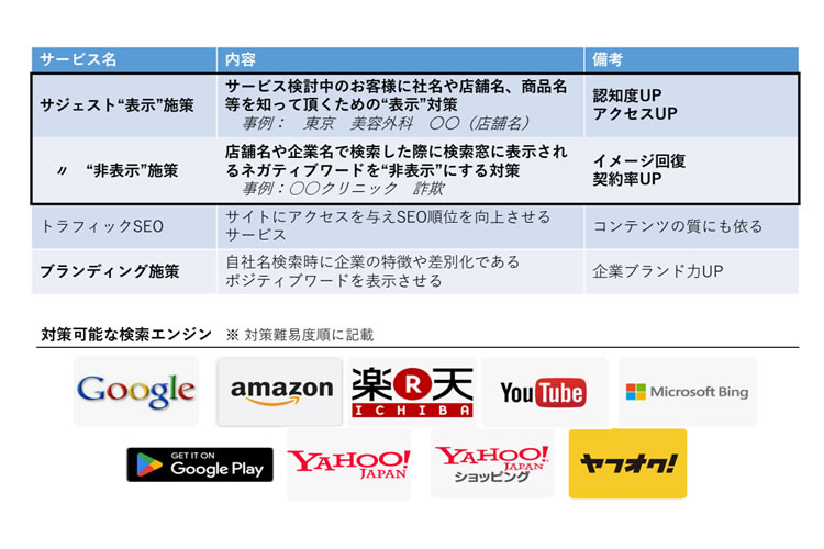 検索サジェスト欄を活用した新手法として注目の「PR&風評対策サービス」は、企業のブランド価値向上と風評リスク低減を両立する高収益ストック型商材です。