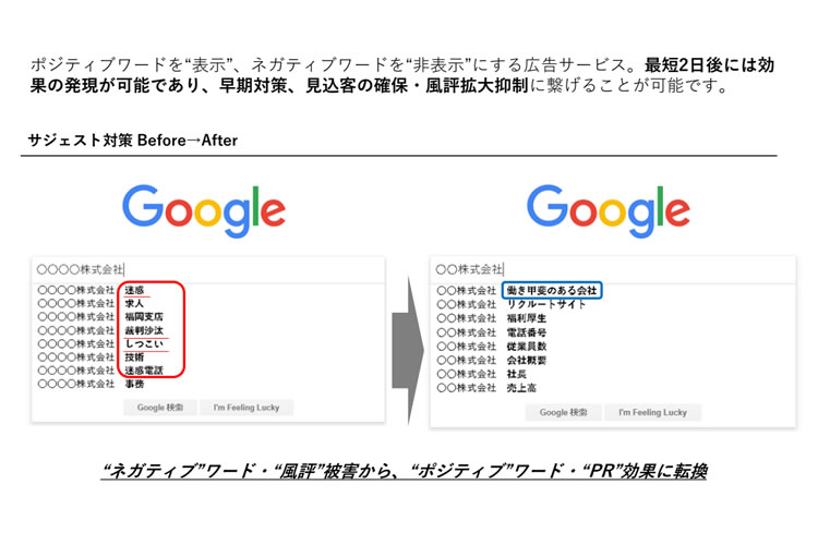 検索時にポジティブなワードを表示、ネガティブなワードを非表示にする2軸の対策で、最短2日で効果が表れ、導入企業から高評価を獲得。成果報酬型で費用対効果も高く、SEOや既存広告施策との親和性も抜群です。