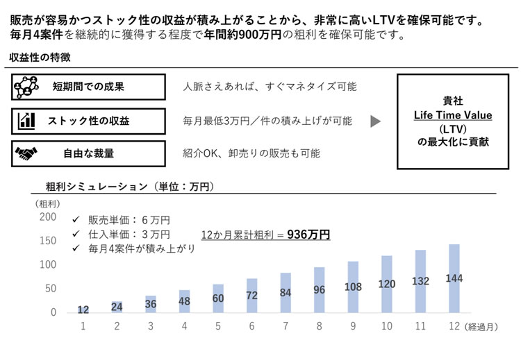毎月4案件を継続的に獲得する程度で年間約900万円の粗利を確保可能です。