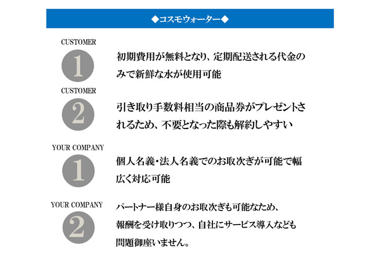 クロスセルに最適な家庭向けインフラ商材!「コスモウォーター」販売パートナー募集