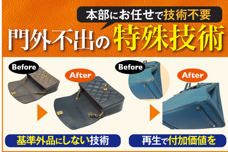 | 特長 | バッグを再生させる技術は弊社がすべて請け負いますので不要です |