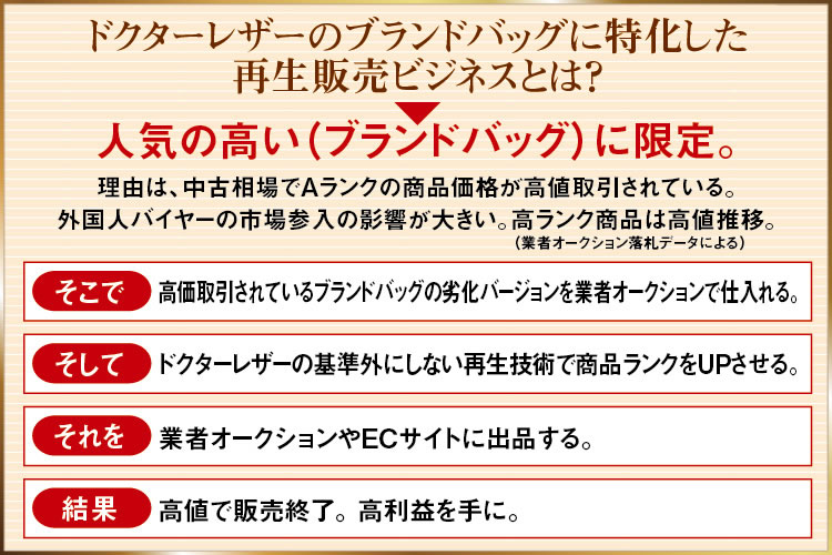 劣化したブランドバッグを安く仕入れ、ドクターレザーの特殊メンテナンス技術で美しく再生。価値を高めて転売する、まったく新しいリユースビジネスモデルです。特別な技術や資格は不要。インターネットでの仕入れ・販売が中心なので、時間も場所も自由。副業にも最適で、努力次第で月収1,000万円超えも可能です。