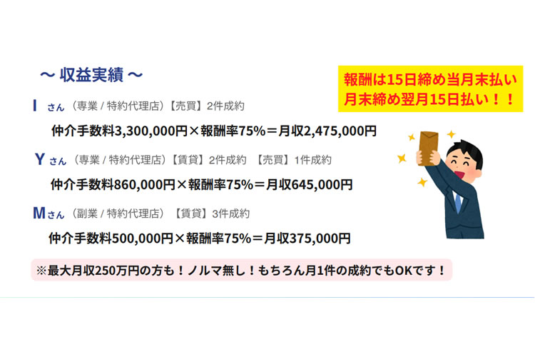 | 収益実績 | ■副業【賃貸】3件成約 仲介手数料500,000円×報酬率75%=月収375,000円 ■専業【賃貸】2件成約【売買】1件成約 仲介手数料860,000円×報酬率75%=月収645,000円 ■専業【売買】2件成約 仲介手数料3,300,000円×報酬率75%=月収2,475,000円 |