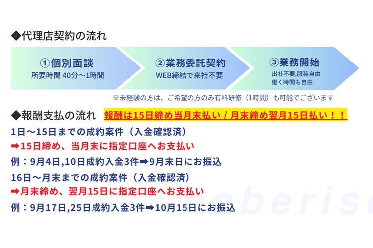 | 特長 | 未経験OK・出社不要・報酬率75%。充実のサポートと柔軟な働き方で、不動産仲介を効率的かつ高収益で始められます。 |
