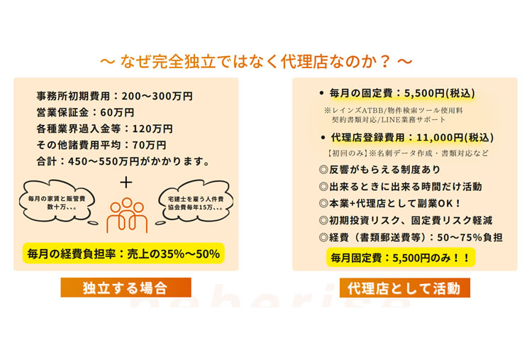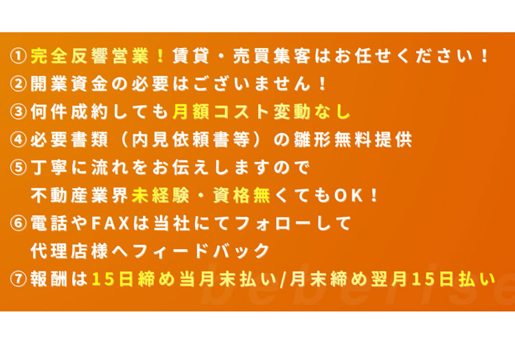 | 特長 | ・完全反響営業!集客はお任せください! ・開業資金の必要はございません! ・何件成約しても月額コスト変動なし ・必要書類(内見依頼書等)の雛形無料提供 ・丁寧に流れをお伝えしますので不動産業界未経験・資格無くてもOK! ・電話やFAXは当社にてフォローして代理店様へフィードバック |