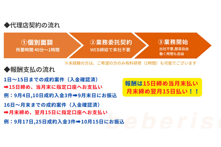 また、報酬の支払いサイクルも明確で、成約・入金が確認された案件については、当月末締め・翌月末払い。キャッシュフローが読みやすく、継続的な運用計画も立てやすい点もポイントです。