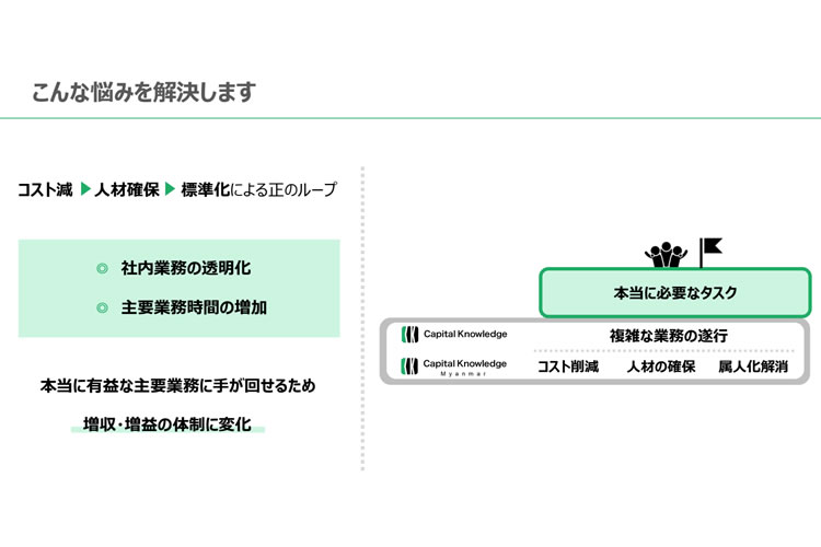 「ミャンマー人材を活用したBPOサービス」は、EC運営やCAD作図、電子書籍化など専門性の高い業務を、ミャンマーの日本語対応人材が遠隔で遂行するアウトソーシングサービスです。