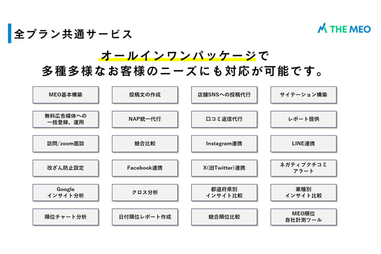 また、サービス内容は「情報の整備」や「口コミ対策」など、どの店舗にも必要とされる基本対策に加え、SNS運用や投稿代行、レポート提出などのオプションもあり、業種や店舗の状況に合わせて柔軟に対応可能。まさに“万能型”の集客支援ツールといえます。