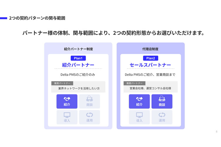 | パートナー制度の特長 | 紹介パートナーは、Delta PMSを第三者の⽴場からご紹介いただく契約形態です。 商談‧契約‧導⼊‧サポートはすべてDelta HQが対応します。 ■主な特長 ・営業、商談なし ・導⼊、運⽤サポートなし ・副収⼊型 ■報酬 ・ご紹介先がDelta PMSを導⼊時の、年払い利⽤料の10%〜最⼤20% ・ショットでのお⽀払い |