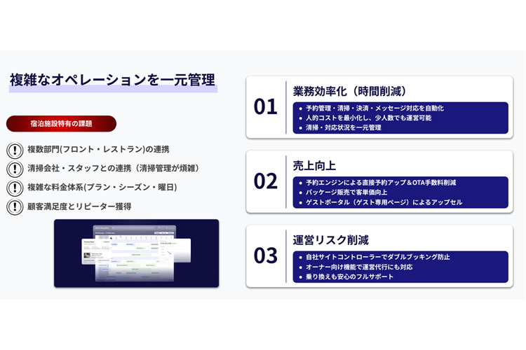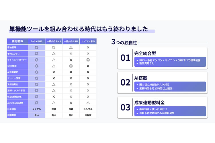 宿泊施設ではPMSや予約エンジン、サイトコントローラー、CRMを個別導入することで管理が煩雑化し、コスト増大が課題となっています。「Delta PMS」はこれらを標準装備した完全統合型クラウドシステムで、追加費用なく一元管理を実現。業務効率化と売上向上をシンプルに訴求できる商材です。