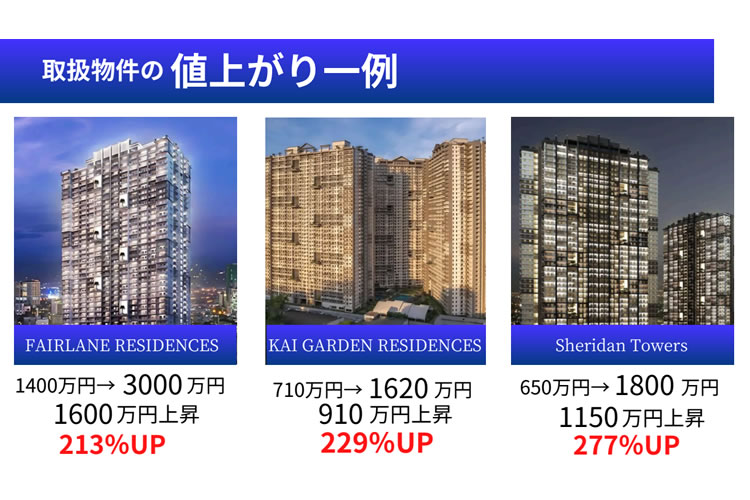 物件C:650万円→1,800万円(277%)このように顧客にとって魅力的な内容のため、提案のしやすさ・信頼性・成約率の高さが揃った商材です。また取り扱いディベロッパー数は国内最多クラスを誇り、数多くのフィリピン優良物件を提案できる環境が整っています。