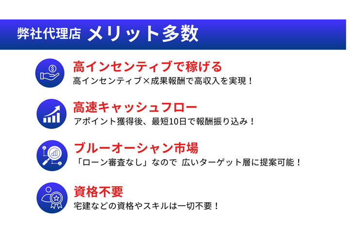 | 報酬実績 | 1件の成約で100万円以上の報酬獲得が可能! 代理店様紹介によるインセンティブもございます。 ・法人:初月740万円/1件 ・個人事業主:初月330万円/1件 ・会社員:初月210万円/1件 |
