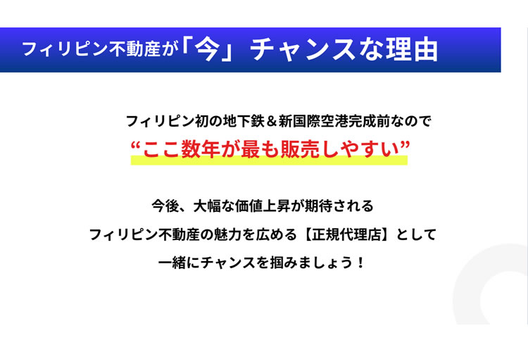 この絶好のビジネスチャンスを活かし、フィリピン不動産を日本国内で紹介・販売する正規パートナーとして、高収益を目指しませんか?
