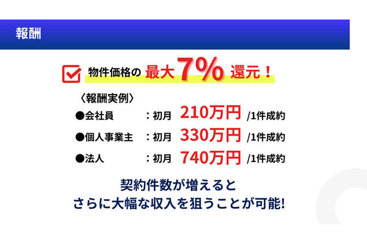 | 収益 | 1件の成約で100万円以上の高報酬(物件価格の最大7%還元) |