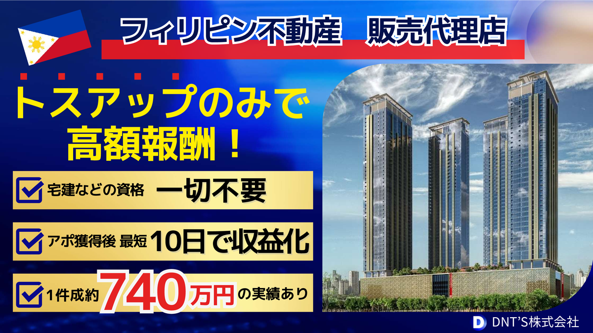 利回り重視物件, 副業, 海外不動産投資, 高額報酬, フィリピンコンドミニアム, トスアップ制度, ブルーオーシャン, ディベロッパー提携, 営業不要ビジネス, 資産運用, 不動産紹介ビジネス, 不動産仲介不要, フィリピン不動産, 東南アジア投資, 海外移住, 投資物件紹介, 不動産成約報酬, 財閥系コンドミニアムあなたにオススメの商材(販路が同じ)