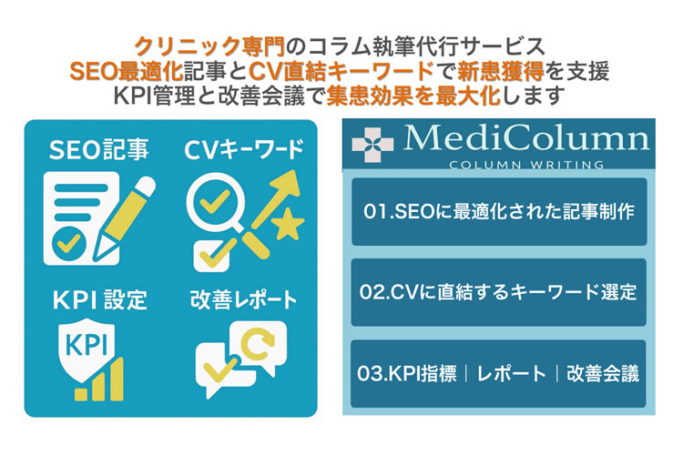 「MediColumn(メディコラム)」は、クリニックや美容サロン向けに特化したSEO記事制作代行サービスです。専門ライターが検索エンジン対策を意識して執筆したコラムをWebサイトに掲載することで、広告費をかけずに集患や認知度向上を実現します。