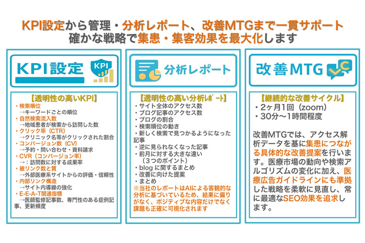 長期間にわたりサービスを利用する中で、「次はこの診療科をもっとPRしたい」「美容施術のページを強化したい」といった追加ニーズが出てくることも少なくありません。こうしたタイミングで新たな提案を行えば、さらなる売上拡大につながる可能性も広がります。