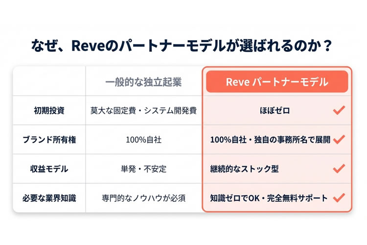 | 特長 | 少人数から無理なく始められ、継続収益が積み上がる仕組みと充実した支援体制により、未経験でも安心して安定した事業成長を目指せる点が特長です。 |