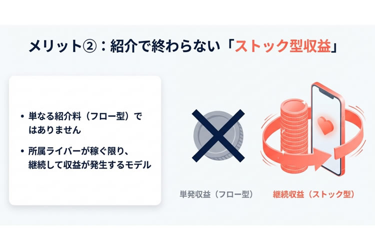 弊社のパートナー制度では、ストック型収益を採用しています。所属するライバーが継続的に配信を行い、活動を続ける限り、収益が積み上がっていく仕組みです。つまり、一度関係性を築いたライバーが長く活躍すればするほど、安定した収益が継続的に発生します。新規獲得だけに追われるのではなく、既存の基盤から収益が生まれ続けるため、事業としての安定性が大きく高まります。