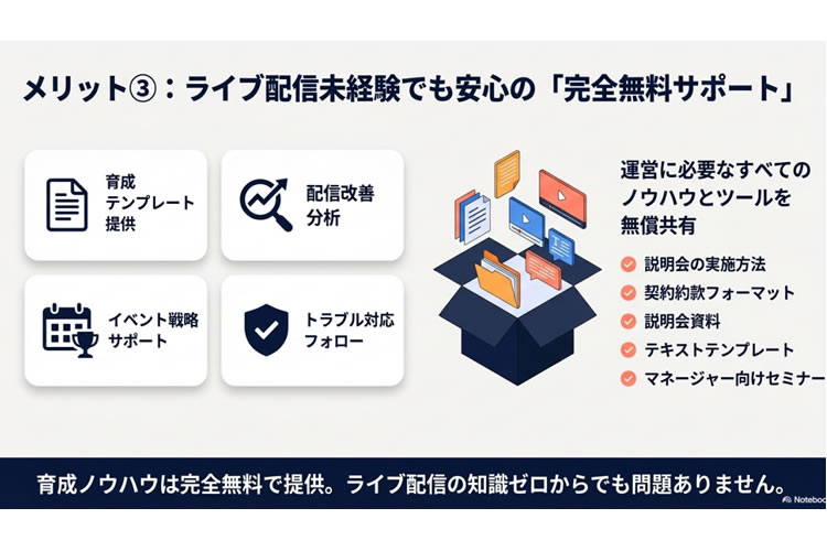 また、ライバーの育成方法や配信改善のポイントなども具体的に共有されるため、経験がなくても着実にスキルを身につけていくことが可能です。「何をすればいいかわからない」という状態になりにくく、迷わず進める点も大きな魅力です。