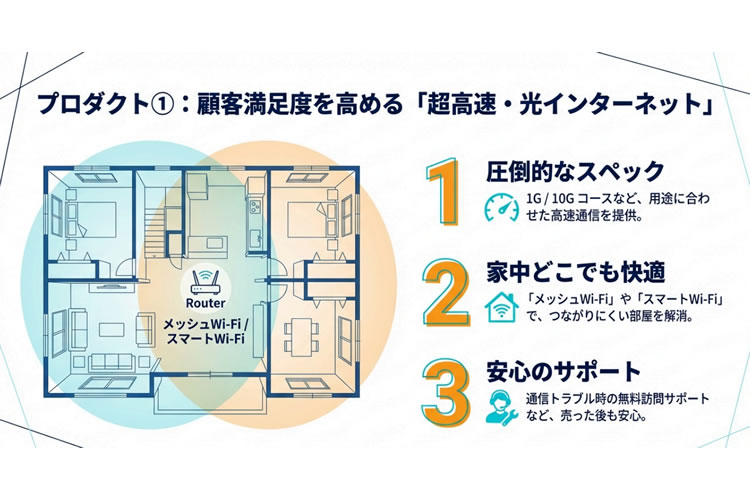 本サービスは、単に「売れる」だけでなく、「満足される」商材であることも強みです。超高速の光回線や、家中どこでも快適に使えるWi-Fi環境など、日常生活の質を高めるサービスを提供しています。