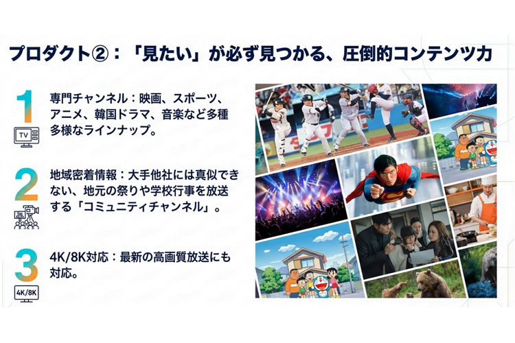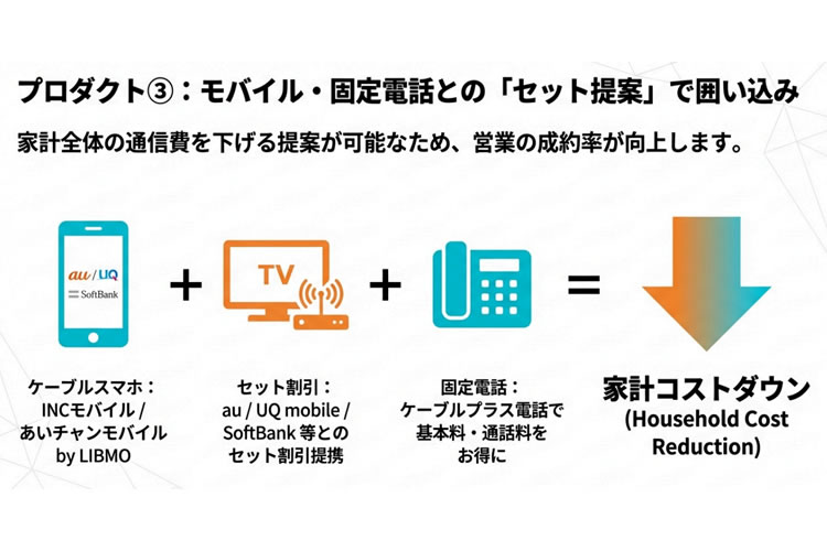 本サービスの魅力のひとつが、テレビ・インターネット・モバイルを組み合わせた「セット提案」が可能な点です。これにより、お客様にとっては通信費の見直しができ、家計の負担軽減にもつながります。