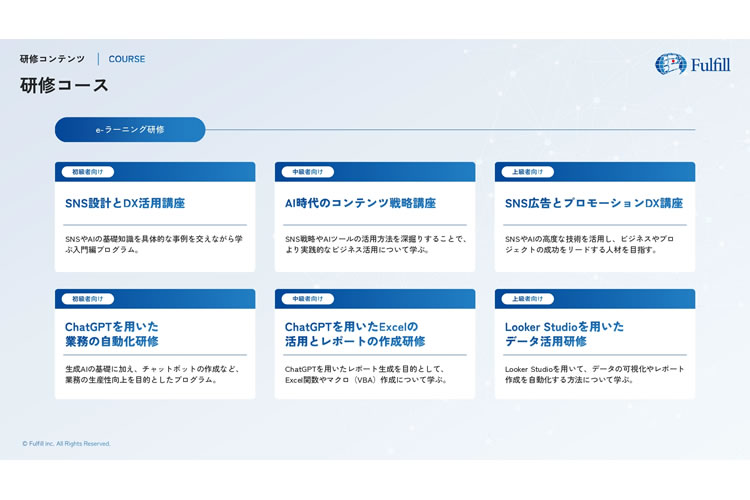 生成AI導入に不安を感じる企業向けに、初心者から実務レベルまで対応した「chatGPT研修」を提供しています。AIの基礎知識やChatGPTなどの操作を実践形式で学び、営業・マーケ・人事など各職種での具体的な活用法を習得可能です。