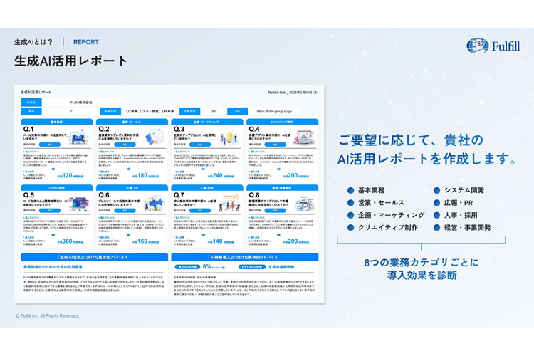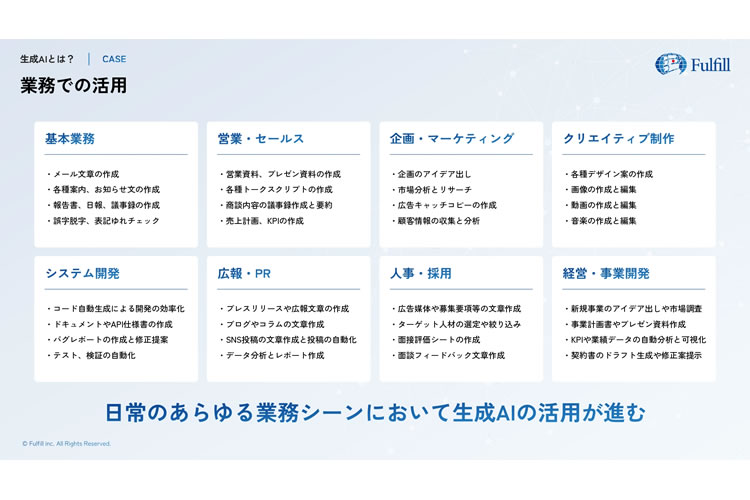 | AI活用シーン | 基本業務/営業・セールス/キカク・マーケティング/クリエイティブ制作/システム開発/広報・PR/人材・採用/経営・事業開発ほか |