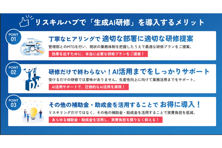 | 特長 | 助成金の活用も可能な、現場で使える生成AI研修プログラムです |