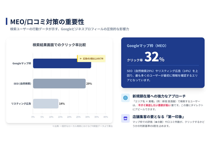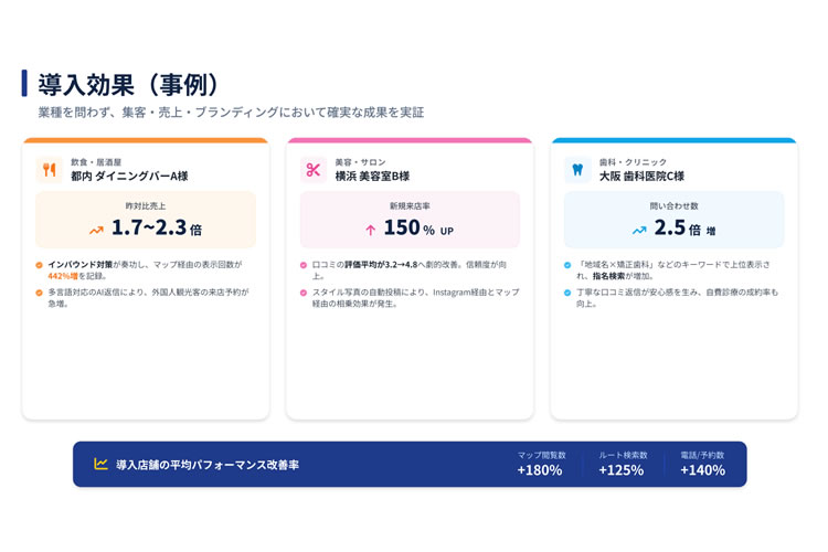 生成AIを活用した口コミ自動生成や多言語対応、SNS投稿支援などにより、単なる順位対策にとどまらず店舗運営全体を効率化できる点も強み。