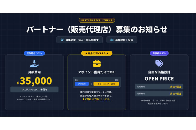 当ビジネスは、専門知識や継続運用の負担を本部が担う仕組みにより、代理店はアポイント獲得に専念できる点が特長です。