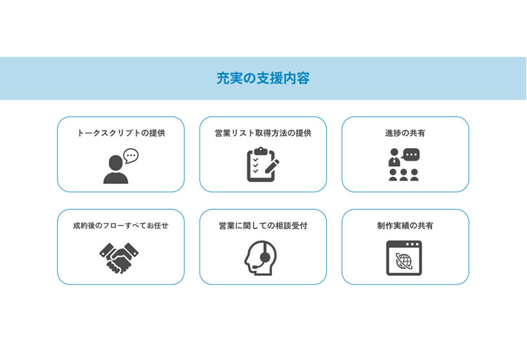 代理店様には、アポ取得を成功させるためのトークスクリプトや、効率的な営業リストの取得方法まで用意しています。どんなタイミングで声をかけ、どのように興味を引くかといったノウハウが明確に示されているため、未経験でも迷わず行動できます。