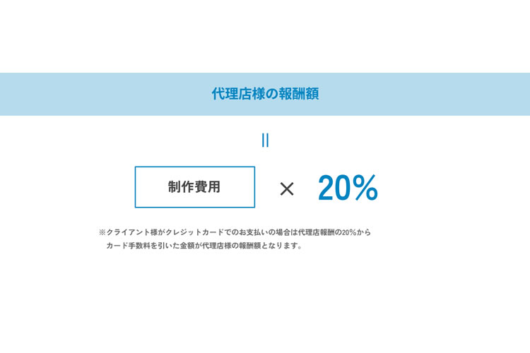 この代理店制度では、1件の成約ごとに制作費の20%をお支払いします。例えば制作費が60万円の案件なら、1件で12万円の報酬が発生します。案件によってはさらに高額になることも珍しくありません。