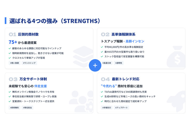 収益性の高さも大きな魅力です。トスアップ報酬に加えて高額なインセンティブが設定されており、平均報酬単価は40,000円、最大で65万円に達する大型案件も取り扱っています 。また、一度の成約で継続的な収入が得られるストック型収益の商材も充実しており、単発の稼ぎに留まらない安定した事業基盤の構築を支援します 。