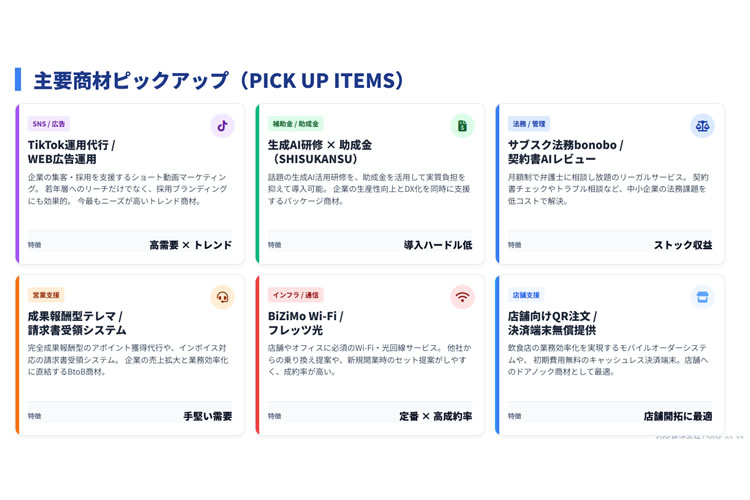 75種類以上の豊富なラインナップの中でも、特に市場ニーズの高い「今売れる」商材がピックアップされています 。例えば、企業の集客・採用に直結する「TikTok運用代行」や、生成AI活用研修を実質負担を抑えて導入できる「助成金パッケージ」など、時代の先端を行く商材を揃えています 。これにより、顧客のあらゆる課題に対して、市場先行の最適な提案が可能です 。