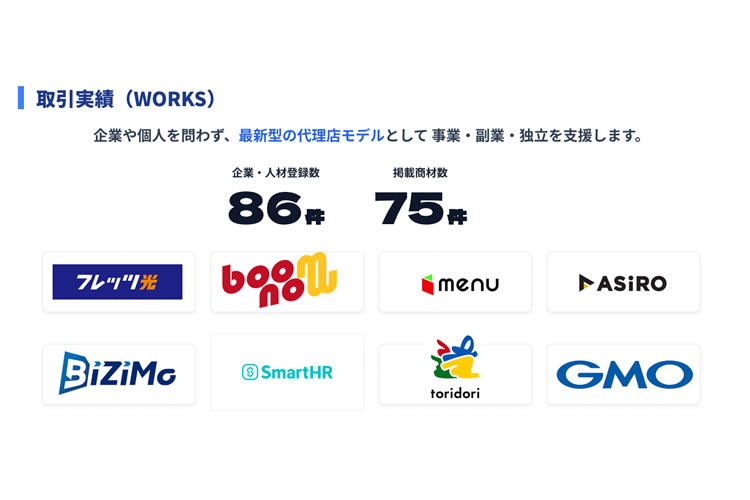 | 特長 | 75種の商材を一括提案でき、市場ニーズに応じて随時アップデート。ストック型収益と充実した学習環境により、安定かつ継続的な事業成長を実現できます。 |