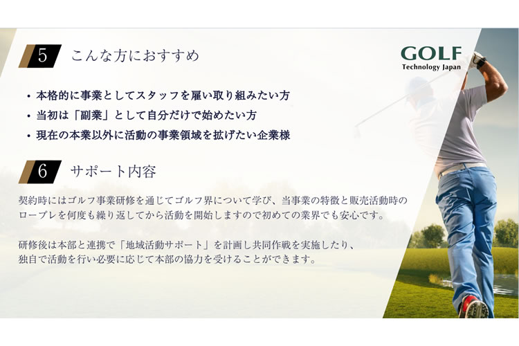 | サポート内容 | 契約時にはゴルフ事業研修を通じてゴルフ界について学び、当事業の特徴と販売活動時の ロープレを何度も繰り返してから活動を開始しますので初めての業界でも安心です。 研修後は本部と連携で「地域活動サポート」を計画し共同作戦を実施したり、 独自で活動を行い必要に応じて本部の協力を受けることができます。 |