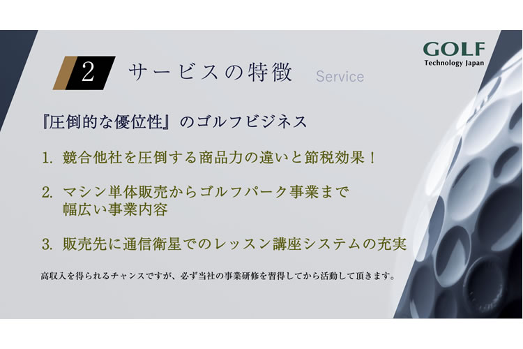 | 事業内容 | ゴルフスイング撮影機の製造、販売事業、ゴルフスクール業、インドアゴルフスクール開業支援事業 |