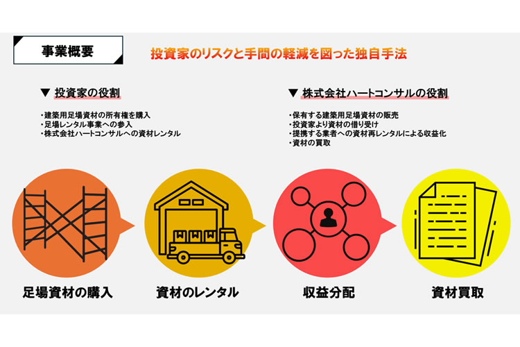 | 事業内容 | 足場レンタル事業、不動産投資コンサルティング、太陽光発電投資コンサルティング、その他各種コンサルティング |