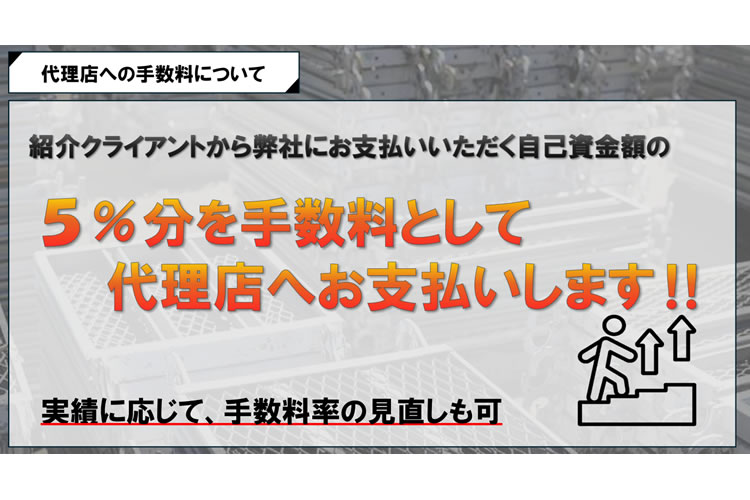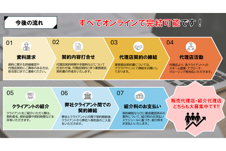 また、紹介のみで報酬が得られる代理店制度も魅力のひとつです。紹介後の商談・契約・管理業務はすべて弊社が対応し、成約時には自己資金額の5%を手数料として還元。営業職・士業・保険販売員などにも人気の、高収益かつ低リスクなビジネスモデルです。