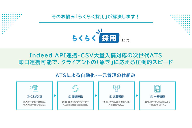 「らくらく採用」は、IndeedAPI 連携・CSV 大量入稿対応の次世代 ATS です。掲載スピードや分かりやすい料金体系についても、多くの企業様より高い評価をいただいております。