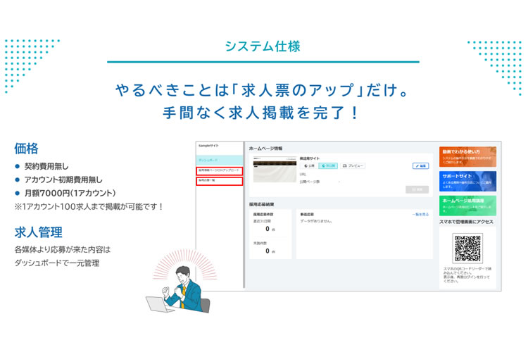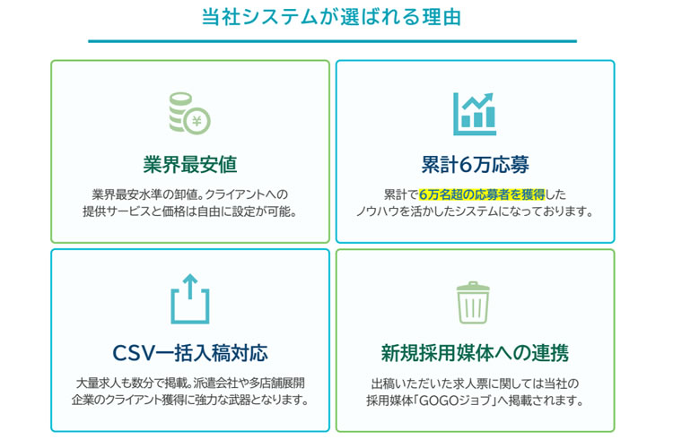 | 特長 | 累計6万名超の応募実績と最短30分掲載のスピードを強みに、特別なシステムも不要で始められる代理店向け採用支援サービス。営業支援体制も整い、成果を出しやすい。 |